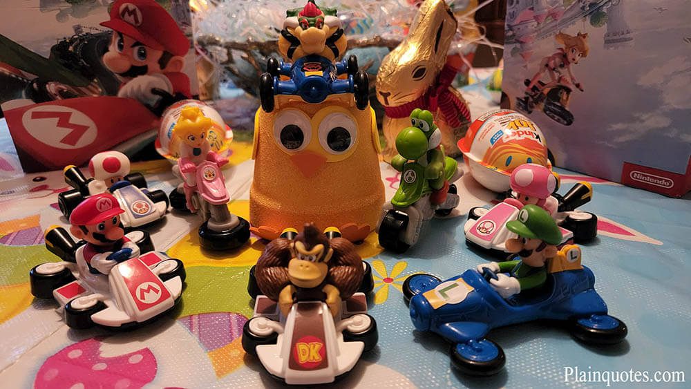 I just love entire collection of this Nintendo Mario Kart Happy Meal. They all make you feel like you are in the game racing and going to win. My favorite goes to Donkey Kong and my second favorite goes to Bowser. Every time I look at Yoshi I feel like his about to stick his tongue out as if its in the game. There are a total 8 in this Collection: