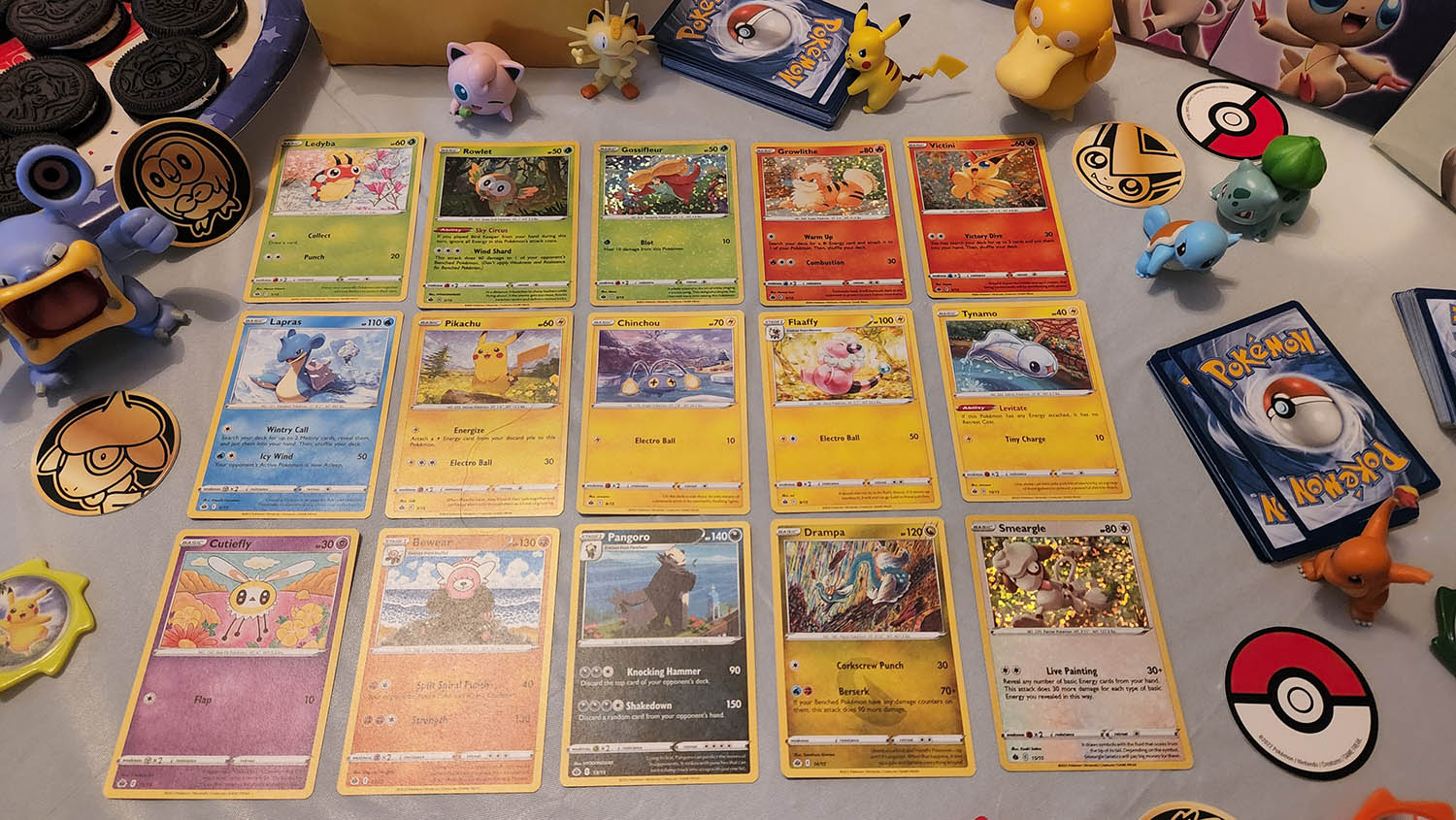 Very happy with this Pokémon Cards and almost feels like a challenge to collect them all. There is a total of 15 cards which includes 6 halos. Check out the Pokémon Cards and they come in a box with a coin, spinner, playing guide, and 4 cards. Seems like I keep getting duplicates and it almost feels like forever just trying to collect them all.