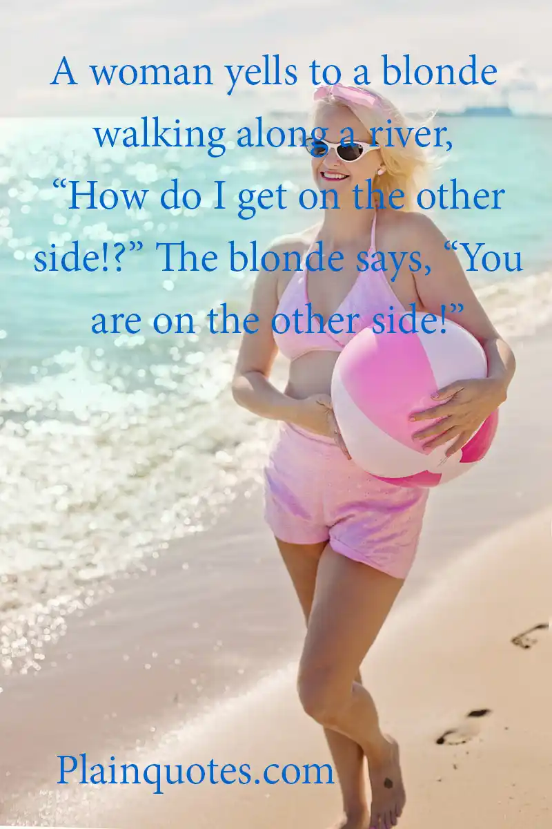 A woman yells to a blonde walking along a river, “How do I get on the other side!?” The blonde says, “You are on the other side!”