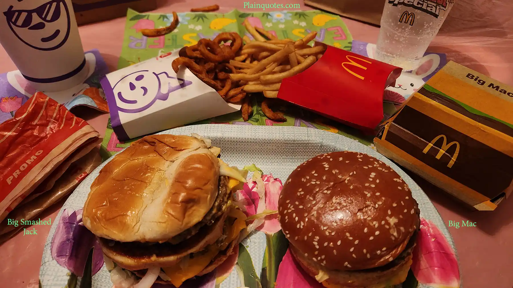 Big Smashed Jack has Brioche Buns while Big Mac has Big Mac Buns which has sesame seeds on it. Jack’s Boss Sauce has a Mayo type of flavors while Big Mac’s Mac Sauce has mustard type of flavors. Big Smashed Jack is 2 quarter pounder patties while McDonald’s is 1/10 lb. patties. That’s prety much it as everything else seems to be the same, except different taste.