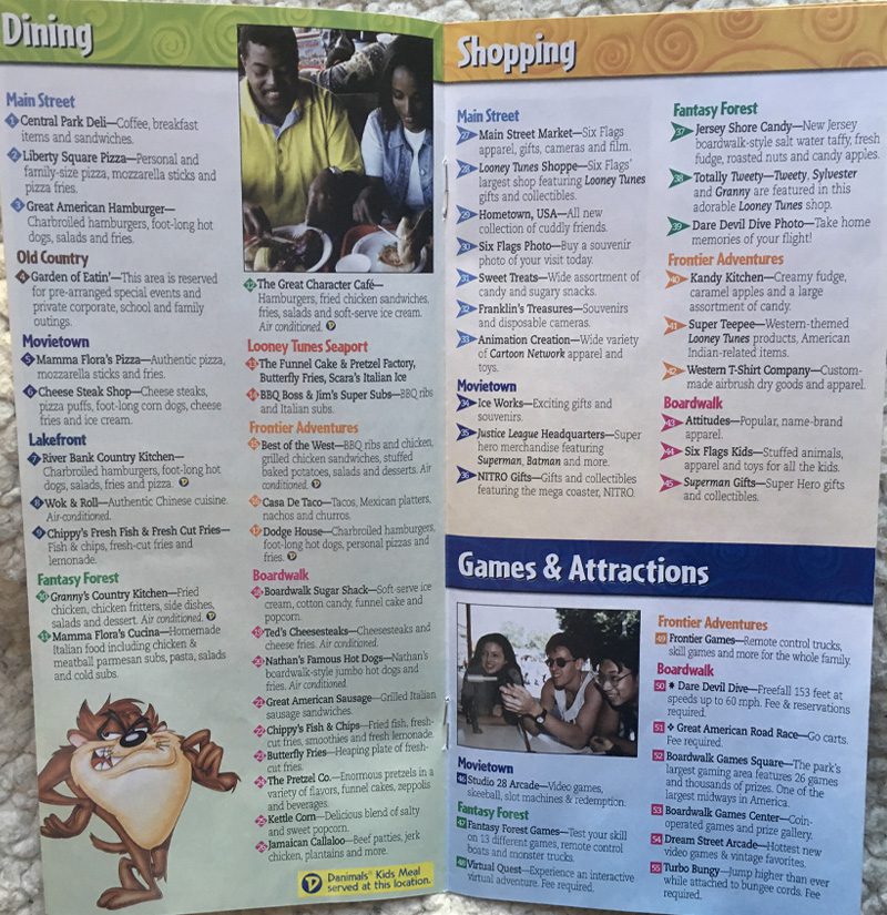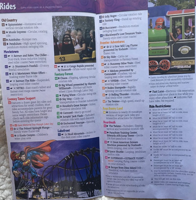 Well what can I say other than that my head is starting to spin just from the cover of this map. There’s dolphins jumping, Bugs Bunny laughing, Superman Flying, Giraffe, & people screaming on the roller coasters. Makes me kind of feel like just wanting to be there to sit on the Superman Ride. Also would love to check out some animals and eat some yummy foods.