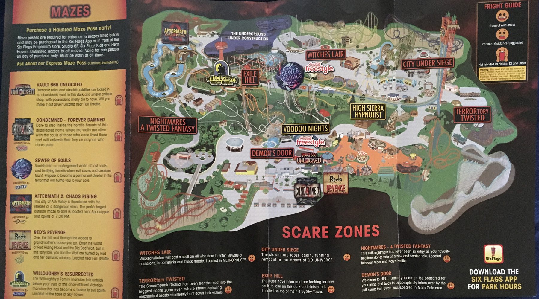 this is the 2019 Six Flags Fright Fest Map Guide. Get you passes and DARE YAHHHH to go through the MAZEZ. This map only opens horizontally and it starts on September 14 and ends on November 3.