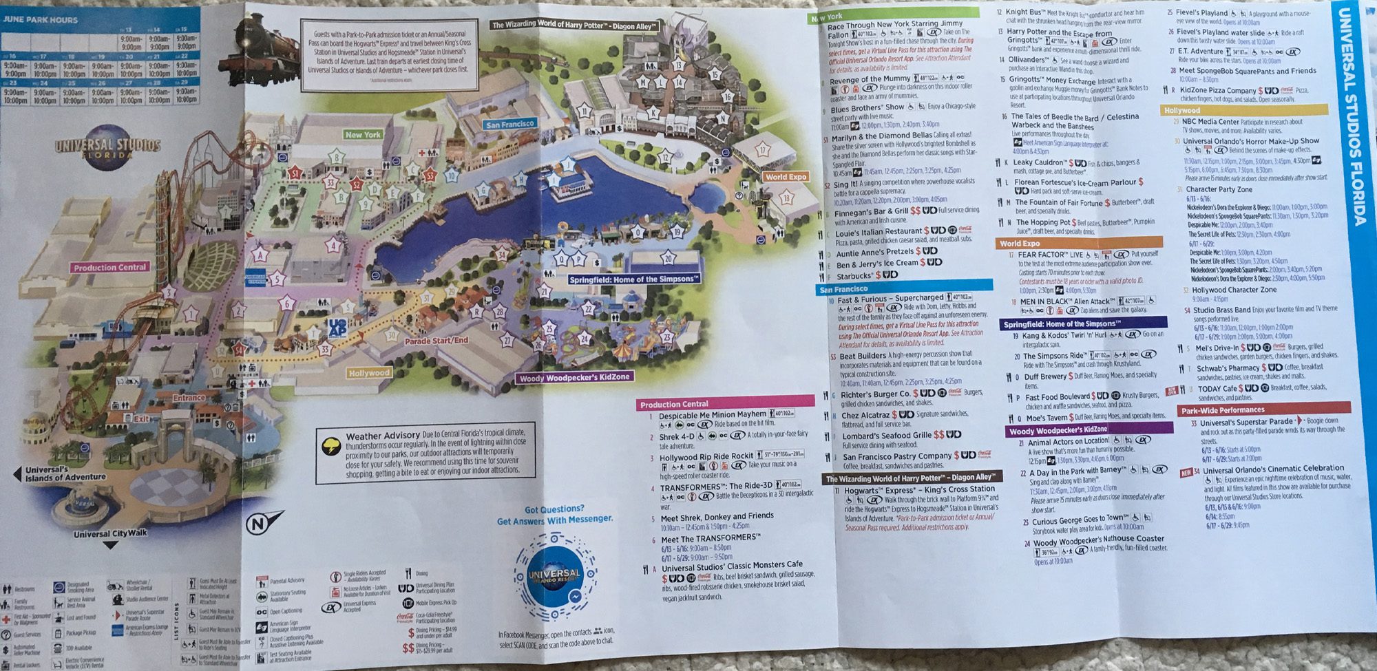 This is the 2019 Universal Studios Orlando Map and Islands of Adventure Map. The Florida Universal Studios is divided into 2 theme parks, so this map includes both parks. Also, I would recommend getting a park ticket that is good for both parks 🙂