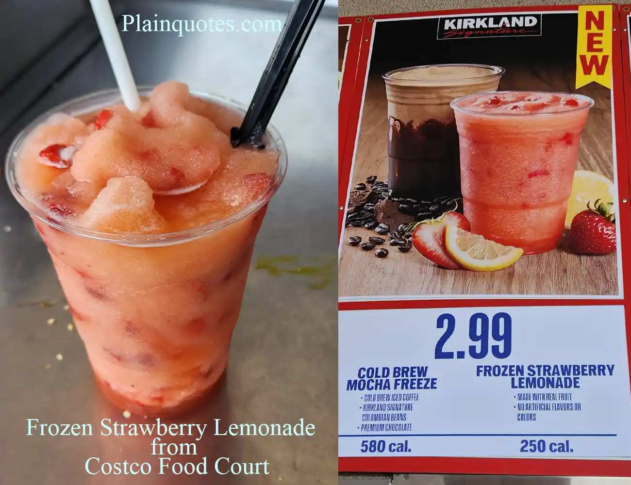 Costco adds a new beverage to the Food Court menu and this time it is Frozen Strawberry Lemonade. It is very refreshing, and it replaces the Strawberry Banana Smoothie. It comes in one size and the price is $2.99 which is just 250 calories. This time, it is a bit unique as it has strawberry chunk pieces inside the drink. Therefore, you can’t really sip with the straw as the strawberry pieces don’t fit in the straw. Which this is great as less plastic waste in the ocean. On top of that, it feels good sipping straight from the cup and getting the sweet chunk of strawberries.