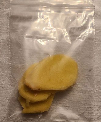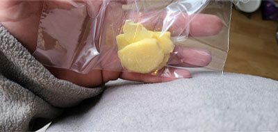 The only ingredient you need is ginger, and this remedy is going to prevent you from getting any sicker. All you need to do is cut the ginger into small pieces and cut the skin layer off of the ginger as well. You could cut it into rectangles, or coin shapes, or triangles. Doesn’t really matter what shape it is, as long as its small candy size and the skin is removed.