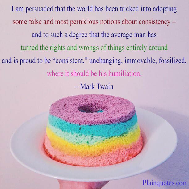and to such a degree that the average man has turned the rights and wrongs of things entirely around and is proud to be “consistent,” unchanging, immovable, fossilized, where it should be his humiliation.” – Mark Twain
