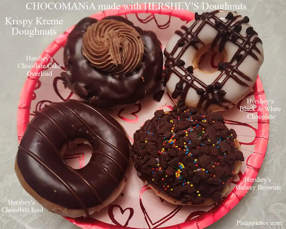 - Hershey’s Chocolate Cake Overload – This one here is an old-fashioned cake doughnut made with Hershey’s and nothing but chocolate from start to finish. As soon as I ate this, it was liked I was hooked to it. The Kreme on top has a dark chocolate taste and each bite is more perfect than the next. (calories 500)