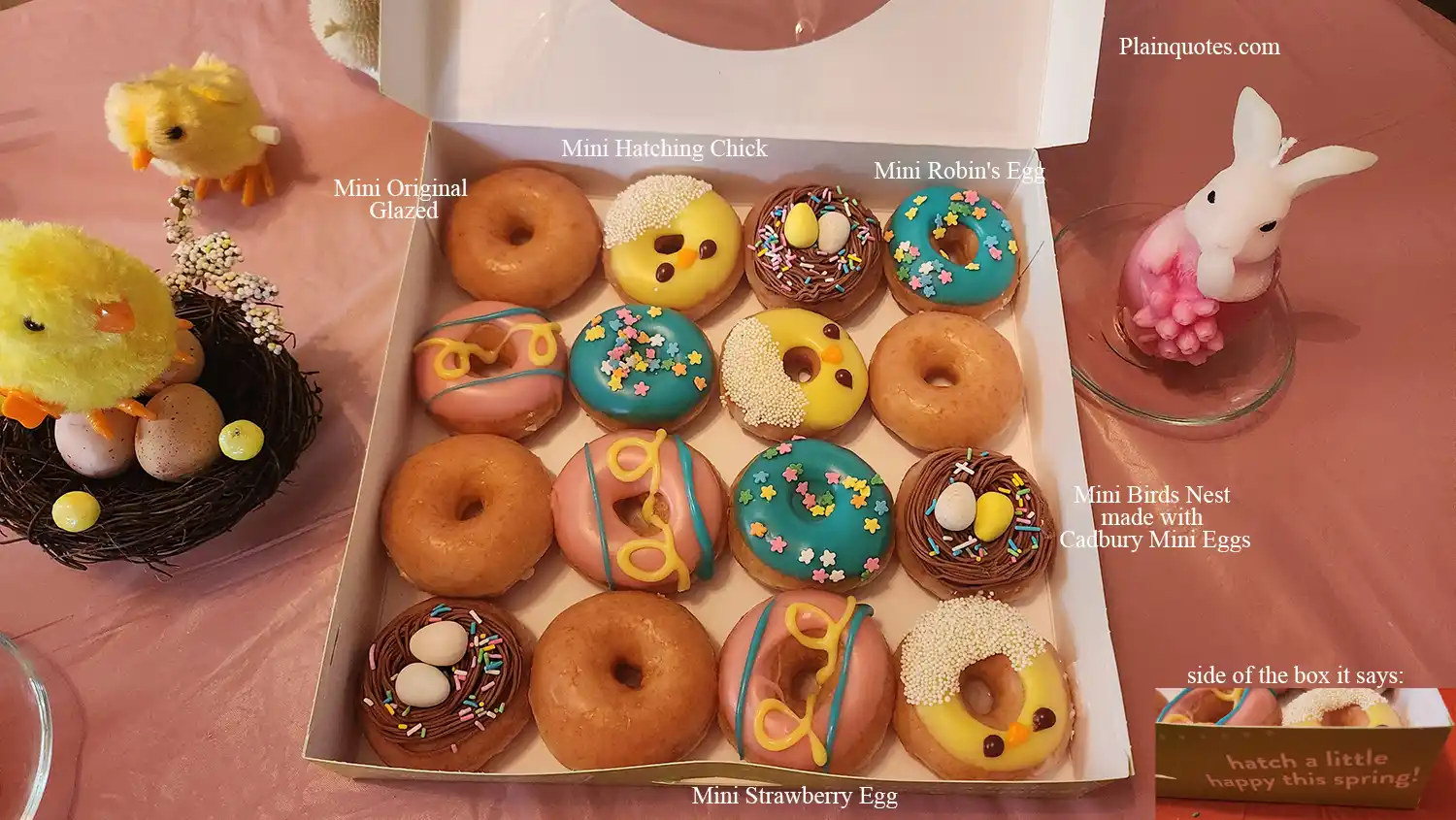 - Mini Hatching Chick – Almost looks like a real Chick and as you eat you just get an Original Glazed taste with just more sweetness. The eyes have a chocolate taste and it kind of dominates when you bite into it. (130 calories)