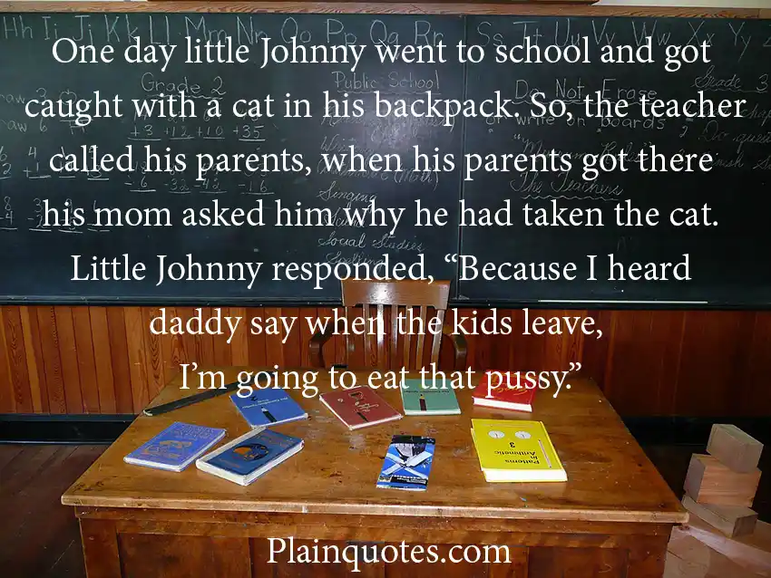 One day little Johnny went to school and got caught with a cat in his backpack. So, the teacher called his parents, when his parents got there his mom asked him why he had taken the cat. Little Johnny responded, “Because I heard daddy say when the kids leave, I’m going to eat that pussy.”