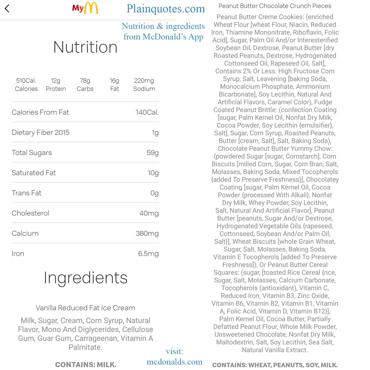 I got this Nutrition Information from the McDonald’s App, and I was trying to find if they might be using any specific chocolate. I’m pretty impressed that it is their own made chocolate and peanut creation be used. Nice work here! However, the ingredients are sure pretty long list. Obviously, this is a dessert and sugar, and high calorie is just expected.