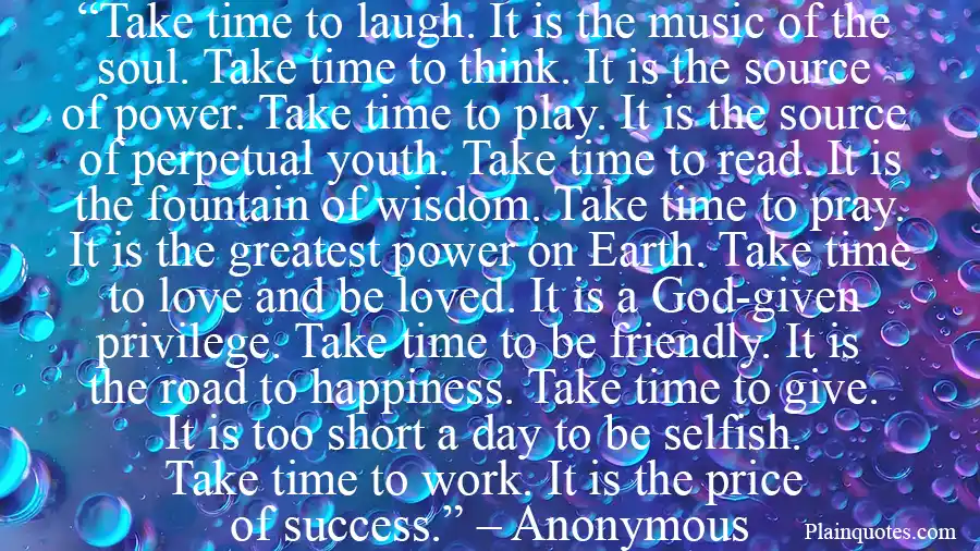 “Take time to laugh. It is the music of the soul. Take time to think. It is the source of power. Take time to play. It is the source of perpetual youth. Take time to read. It is the fountain of wisdom. Take time to pray. It is the greatest power on Earth. Take time to love and be loved. It is a God-given privilege. Take time to be friendly. It is the road to happiness. Take time to give. It is too short a day to be selfish. Take time to work. It is the price of success.” – Anonymous