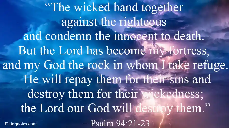 “The wicked band together against the righteous and condemn the innocent to death. But the Lord has become my fortress, and my God the rock in whom I take refuge. He will repay them for their sins and destroy them for their wickedness; the Lord our God will destroy them.” – Psalm 94:21-23